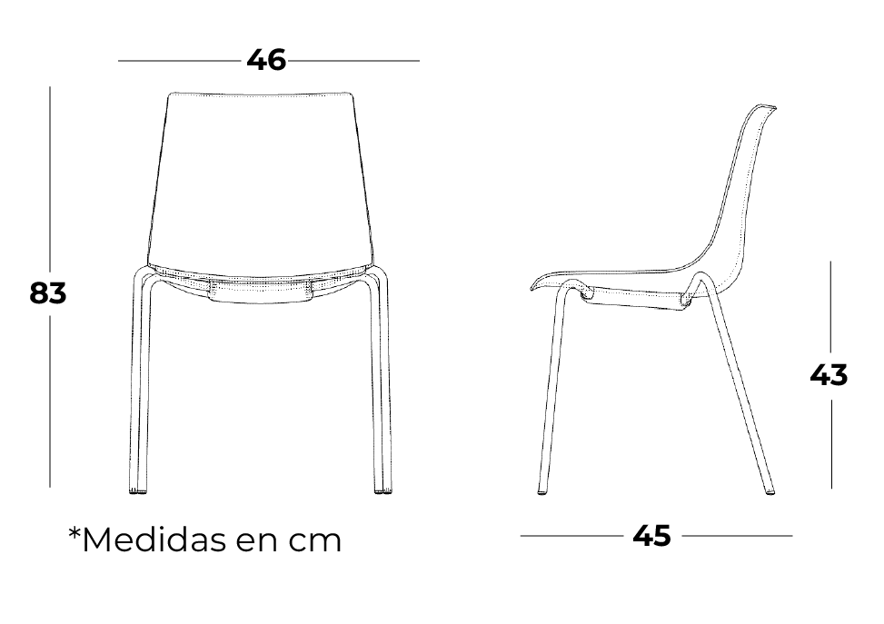 Asiento y respaldo en carcasa de polipropileno flexible de alta calidad en blanco o negro, con acabado pulido brillante en parte posterior, forma ergonómica.