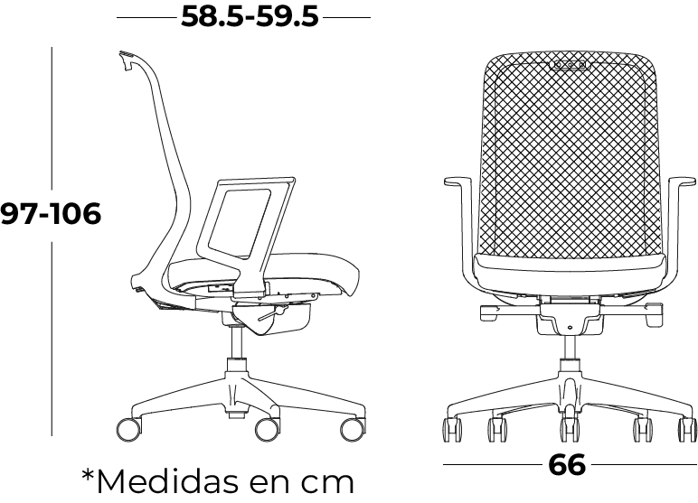 Base de 5 puntas elaborada en nylon reforzado con cinturón de acero.Mecanismo sincrónico autopesante elaborado con placa de acero cal.10. con 3 ángulos de reclinamiento. Profundidad de asiento Slider.Garantía: 5 años.